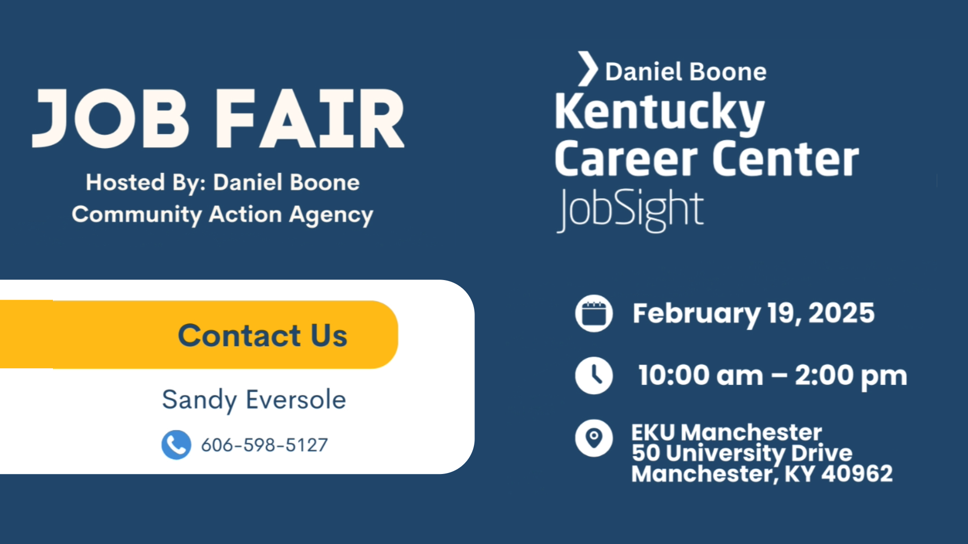 The Daniel Boone Community Action Agency will host a Job Fair on February 19, 2025 from 10:00 AM – 2:00 PM at EKU Manchester, 50 University Drive, Manchester, KY 40962.
