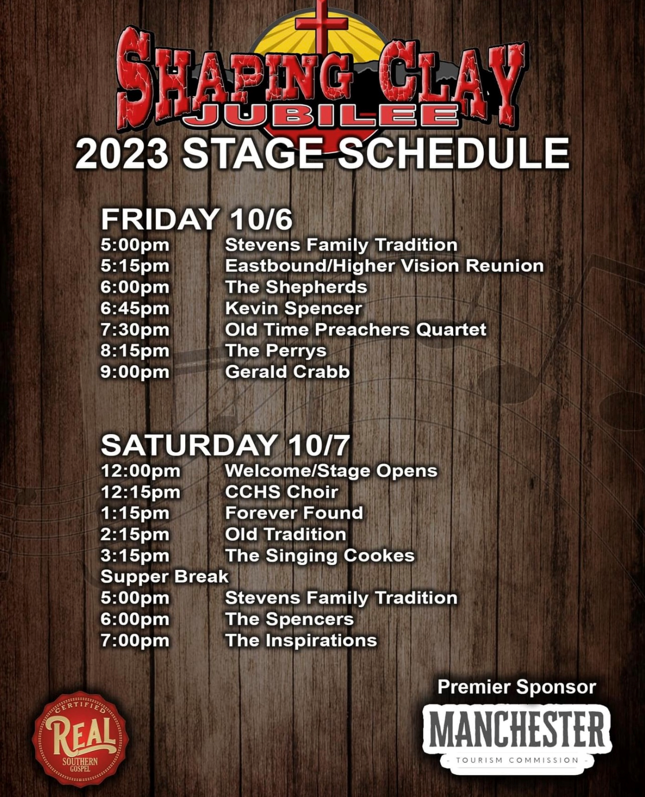 The Shaping Clay Jubilee will take place on Friday, October 6 and Saturday, October 7th at Rawlings Stinson Park in Manchester, Kentucky. You can learn more by visiting their event page on Facebook at https://www.facebook.com/events/325514660135024/ or on the Shaping Clay Ministries Facebook page at https://www.facebook.com/shapingclayministries/.