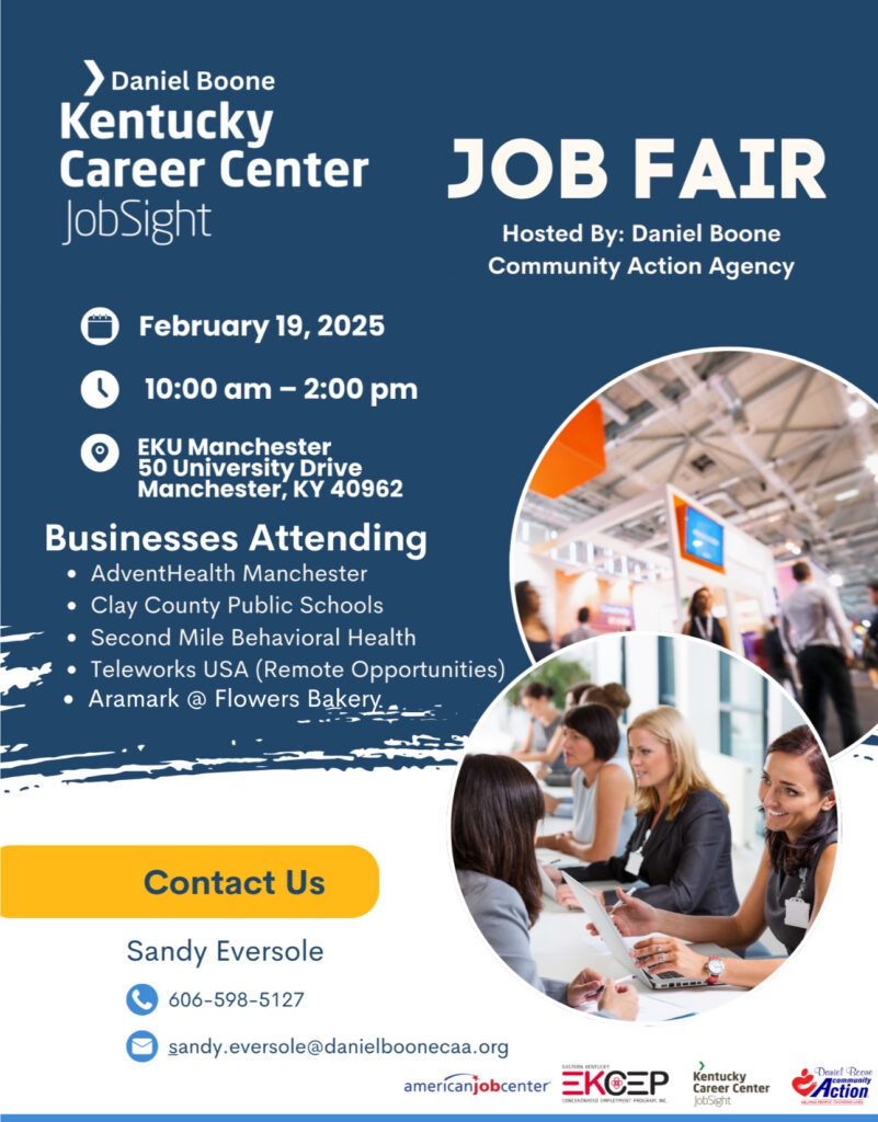The Daniel Boone Community Action Agency will host a Job Fair on February 19, 2025 from 10:00 AM – 2:00 PM at EKU Manchester, 50 University Drive, Manchester, KY 40962.